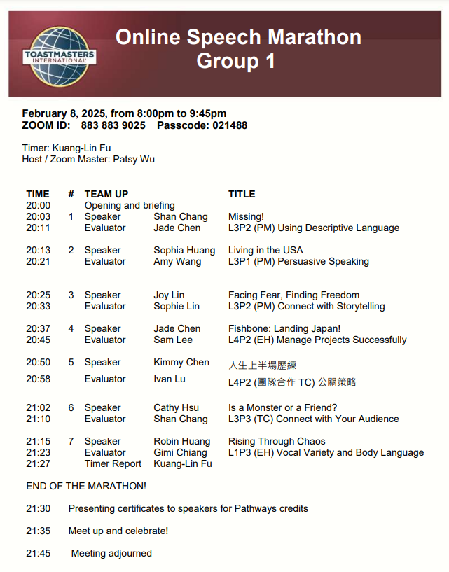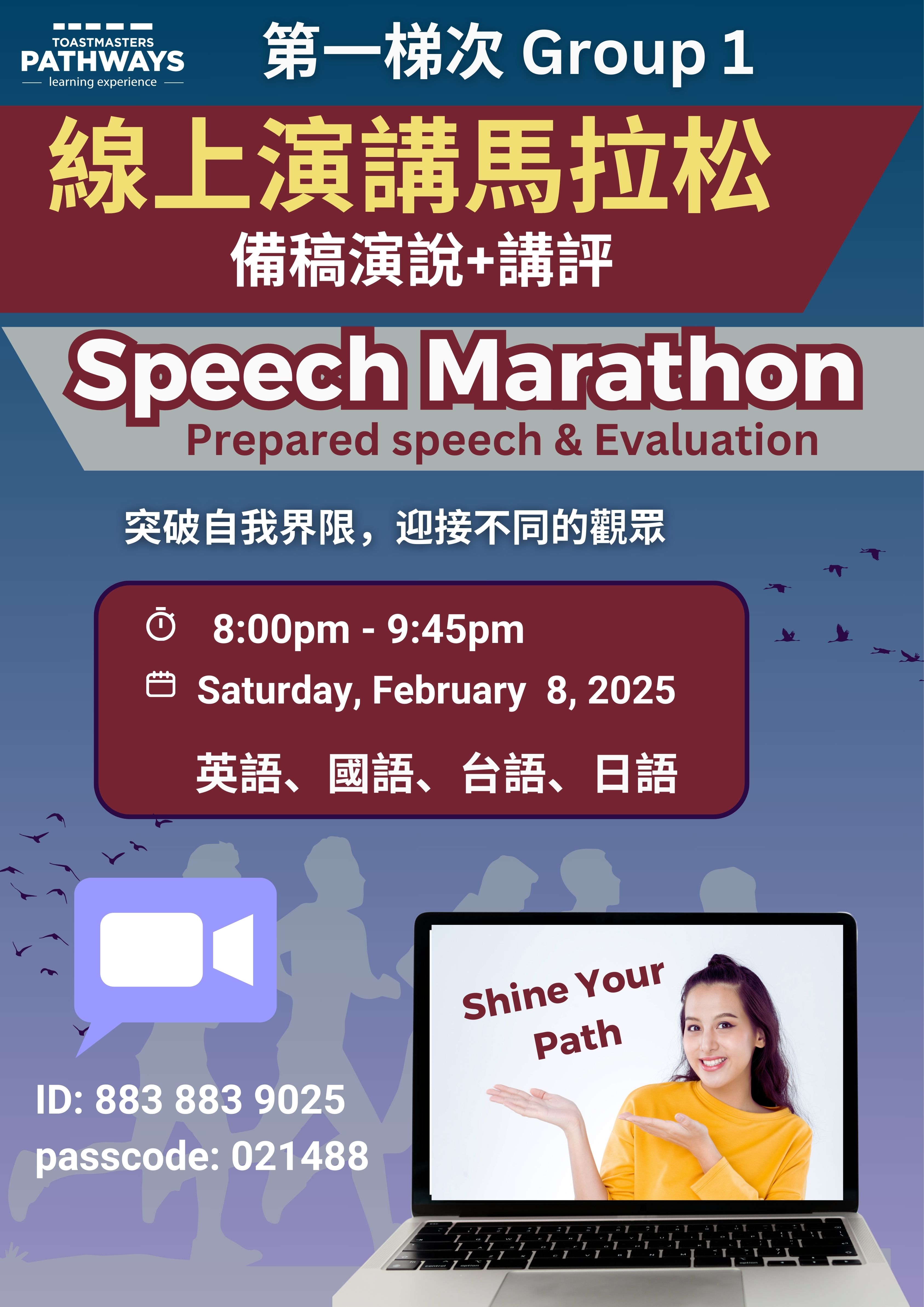 線上演講馬拉松ㄧ共有四個梯次。(2/8,2/22,3/15,3/29 晚間八點至九點四十五分),每一場各有七位會友演說、七位會友講評。演講的會友,依據Pathways 單元進行(5-7)分鐘演說,演說後,立即由一位講評員給予回饋!不但可以進行pathways單元,並且還可以相互學習!